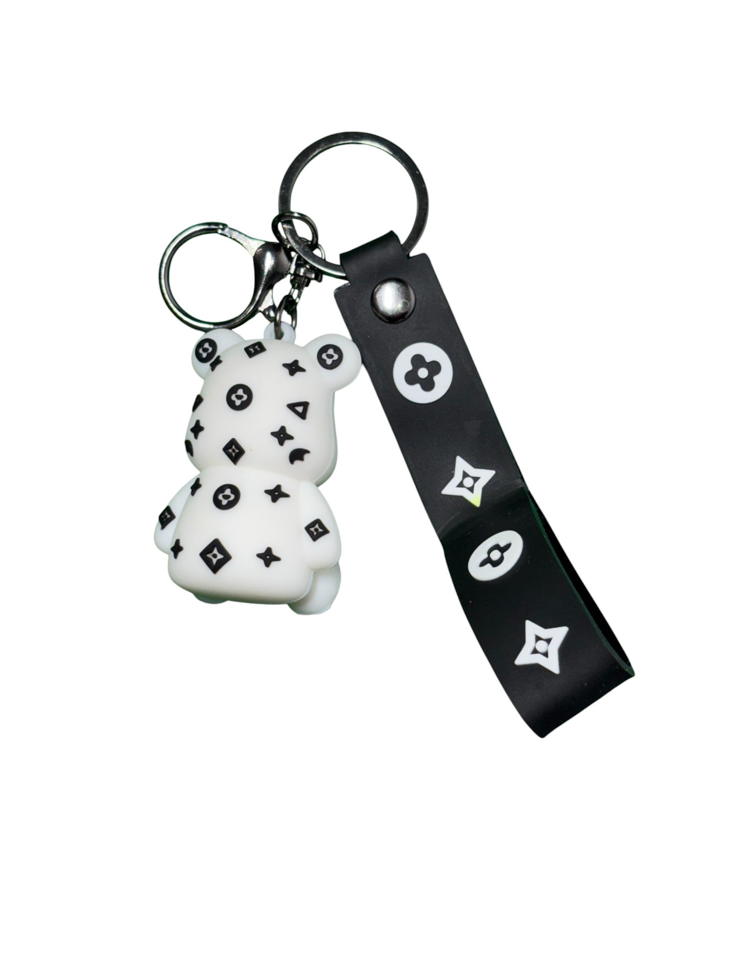 This stylish keychain features a cute, monochrome design that adds a trendy touch to your keys, bag, or backpack. The charm is a white teddy bear figure, with a unique black pattern of shapes and symbols. It is attached to a durable, black lanyard strap, also decorated with a repeating pattern of white symbols.